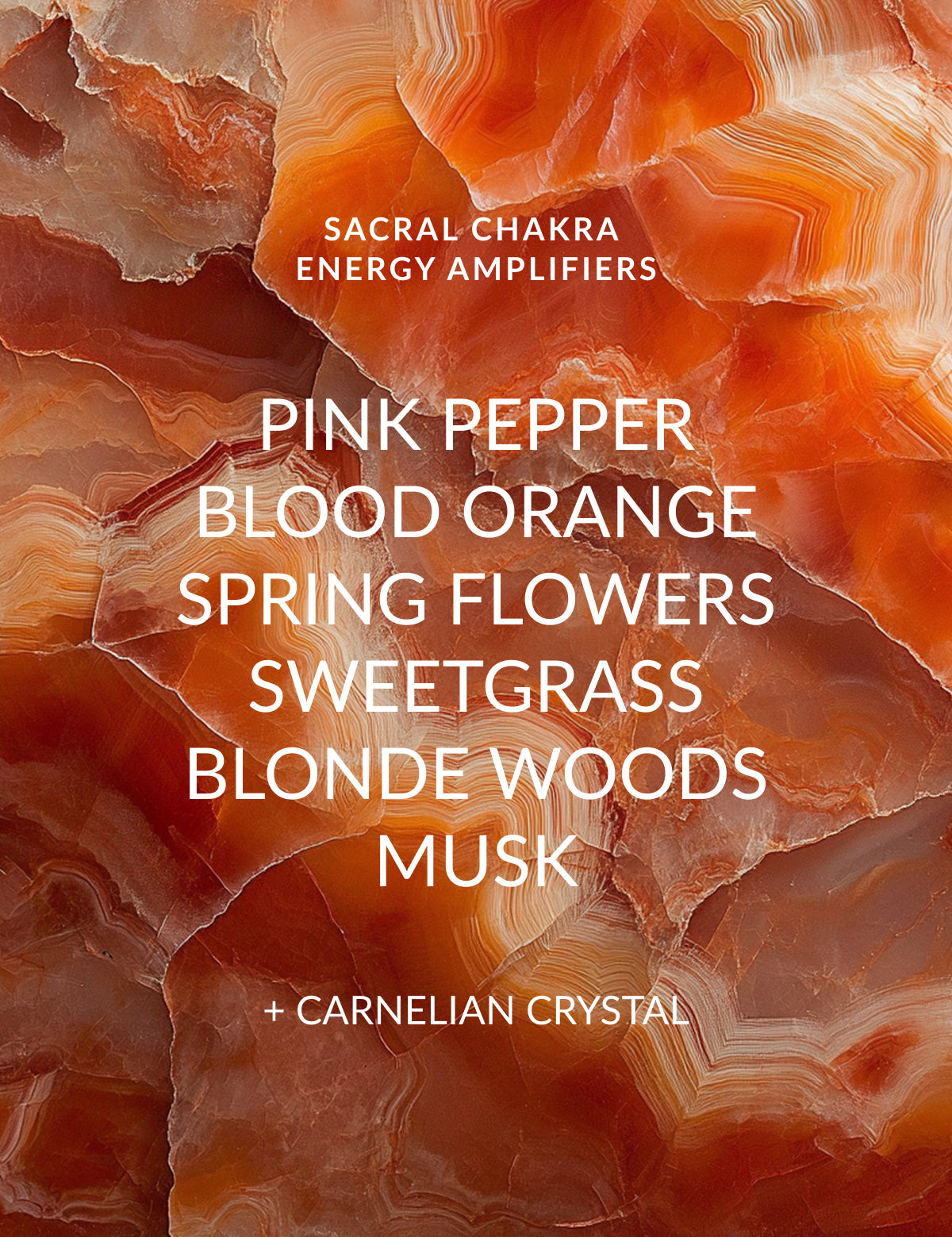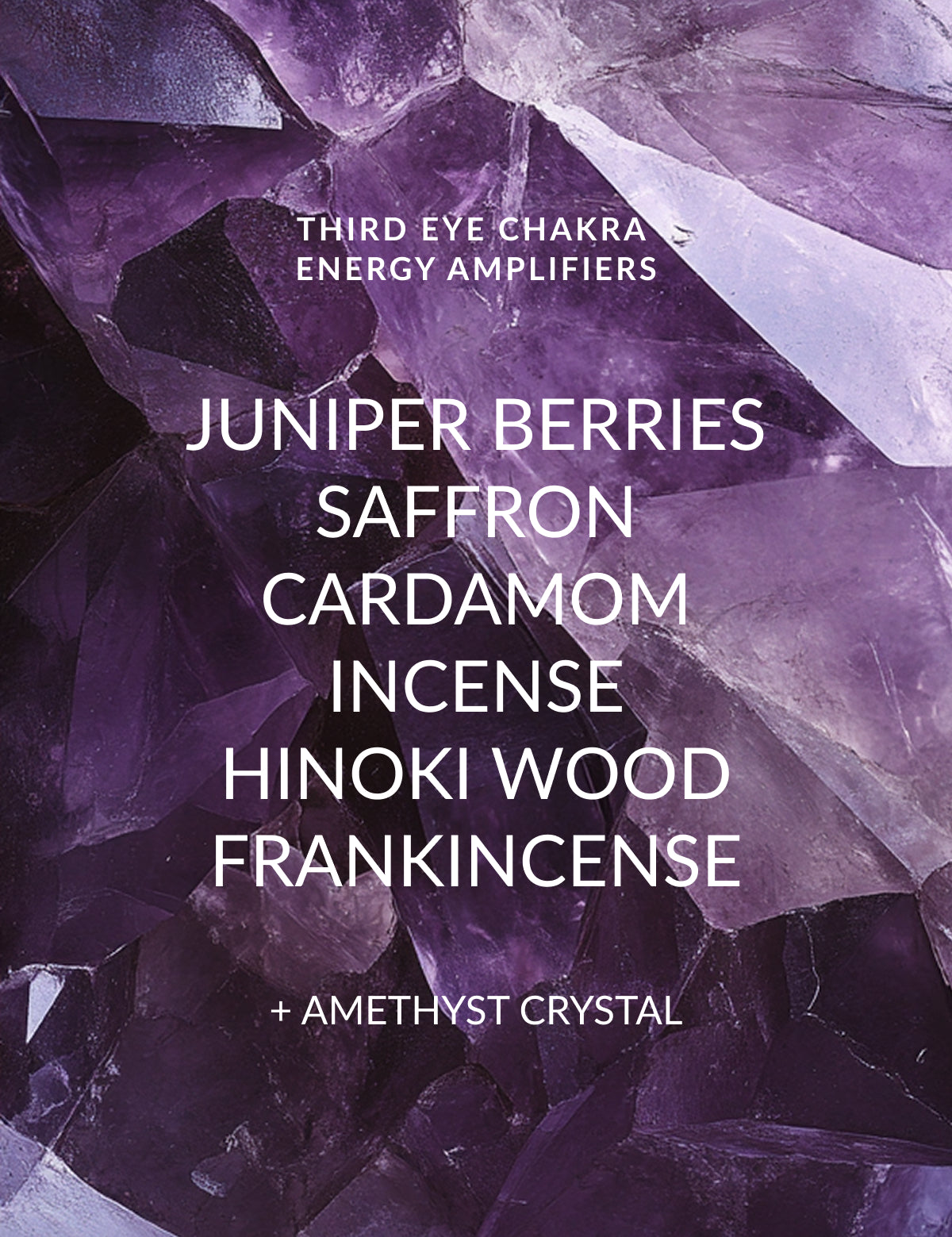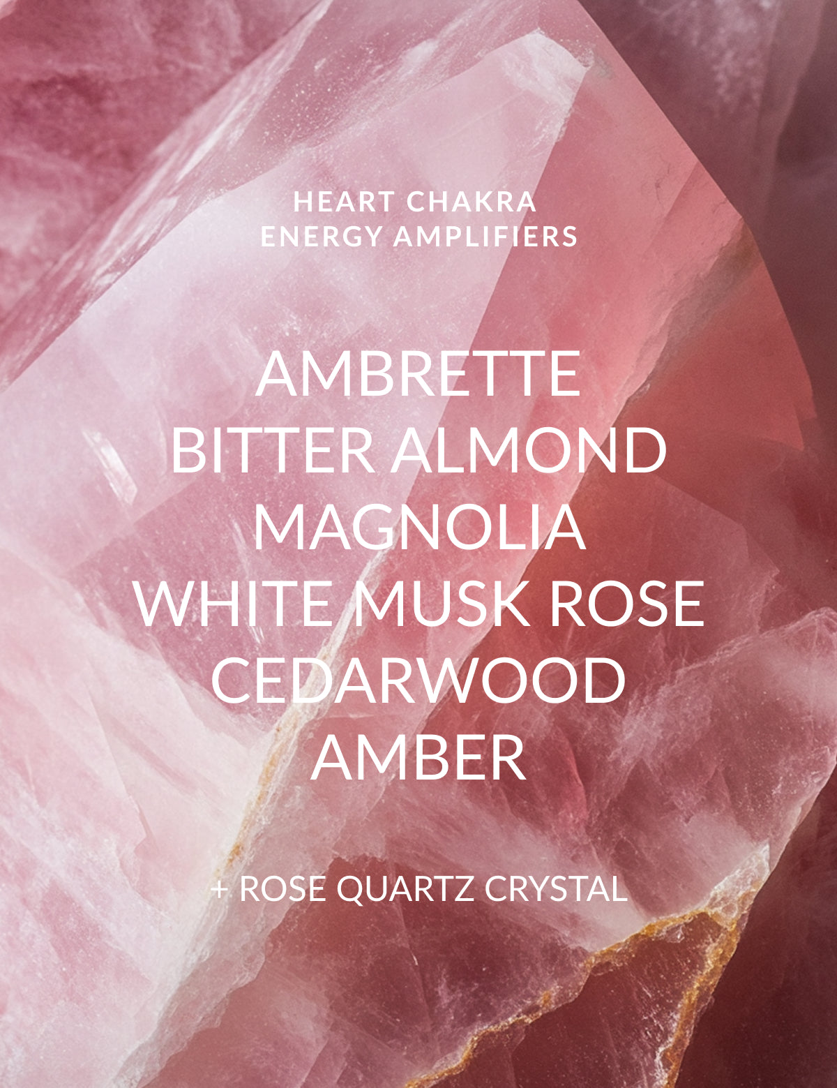 Each parfum bottle contains an activated crystal to amplify the vibrational frequency of the chakra it aligns with.